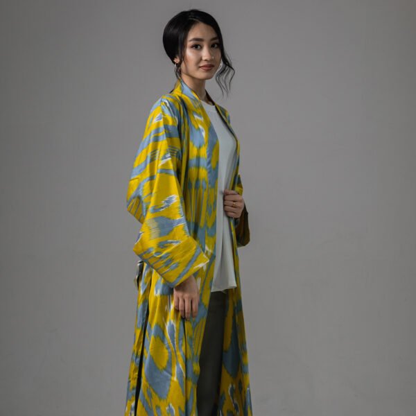 Each robe is made from 100% natural cotton (or silk) and hand-dyed using the authentic ikat resist-dyeing method, giving it its unique, vibrant patterns and soft, breathable texture.